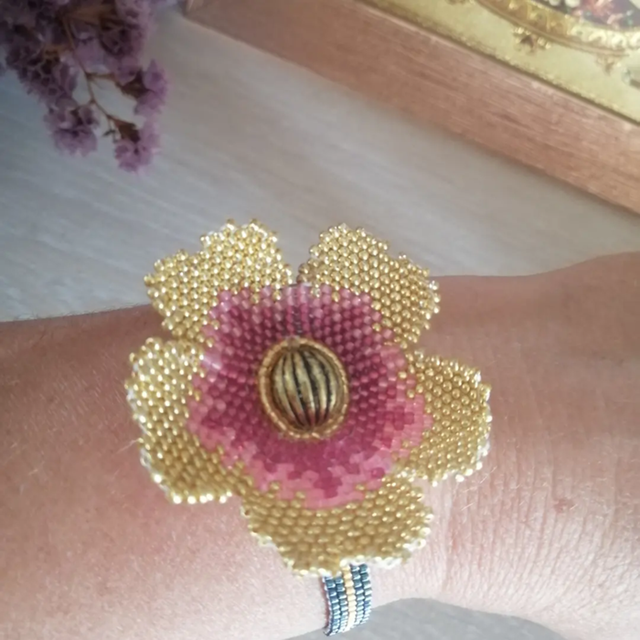 Voici un magnifique bracelet fleur en perles de rocailles Miyuki et chaîne d'extension en acier inoxydable doré.