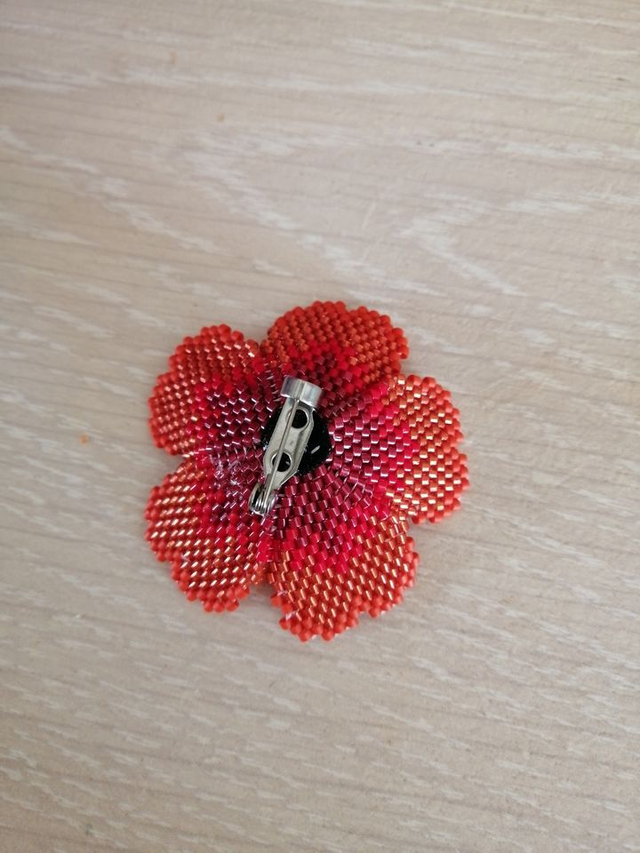 Broche coquelicot de 5 cm de diamètre tissé avec des perles miyuki delica 11/0 en point brick stitch.