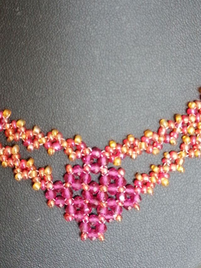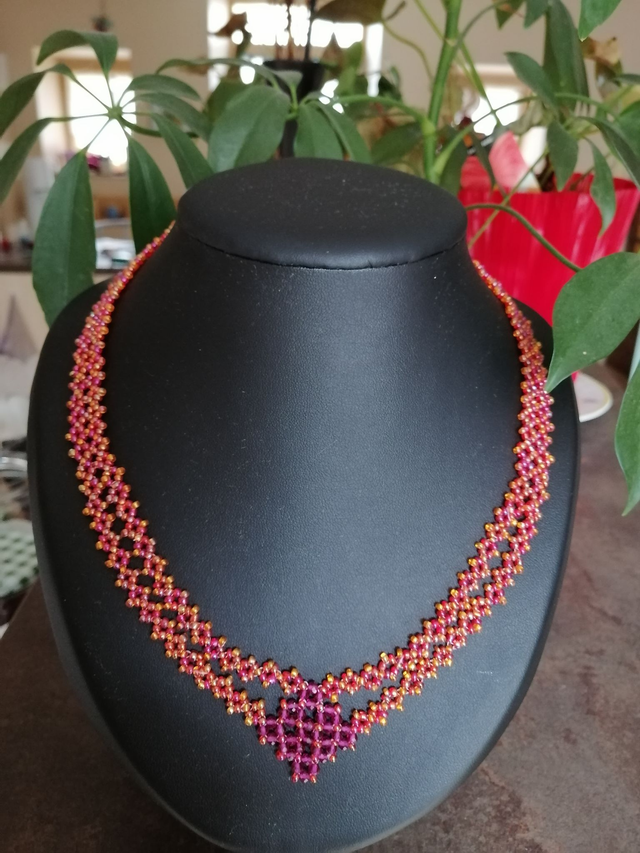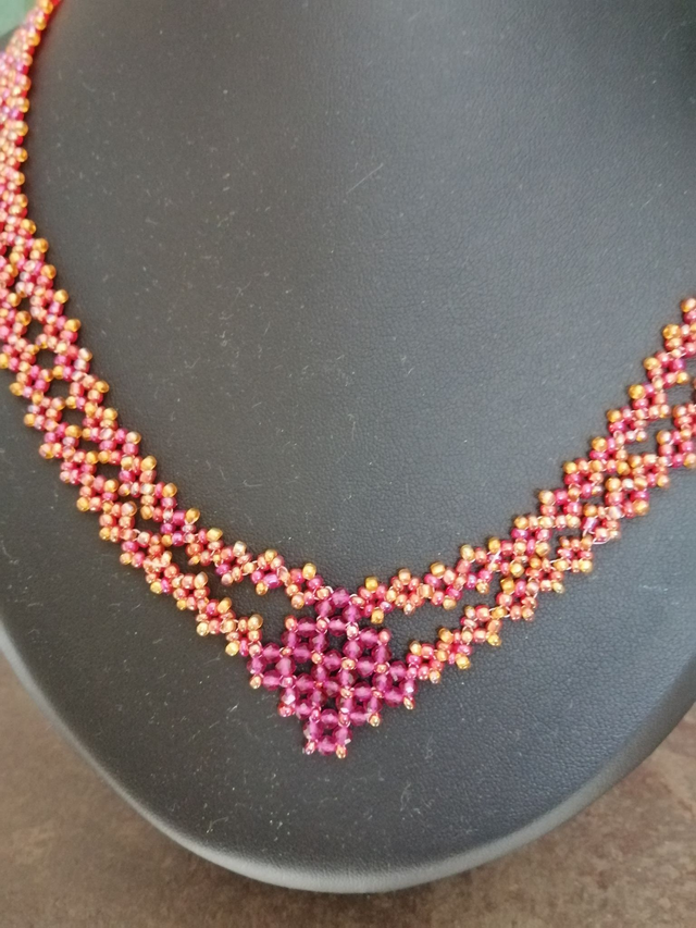 Voici un magnifique collier en perles de rocaille 11/0 de deux couleurs : orange et rouge nacré.
